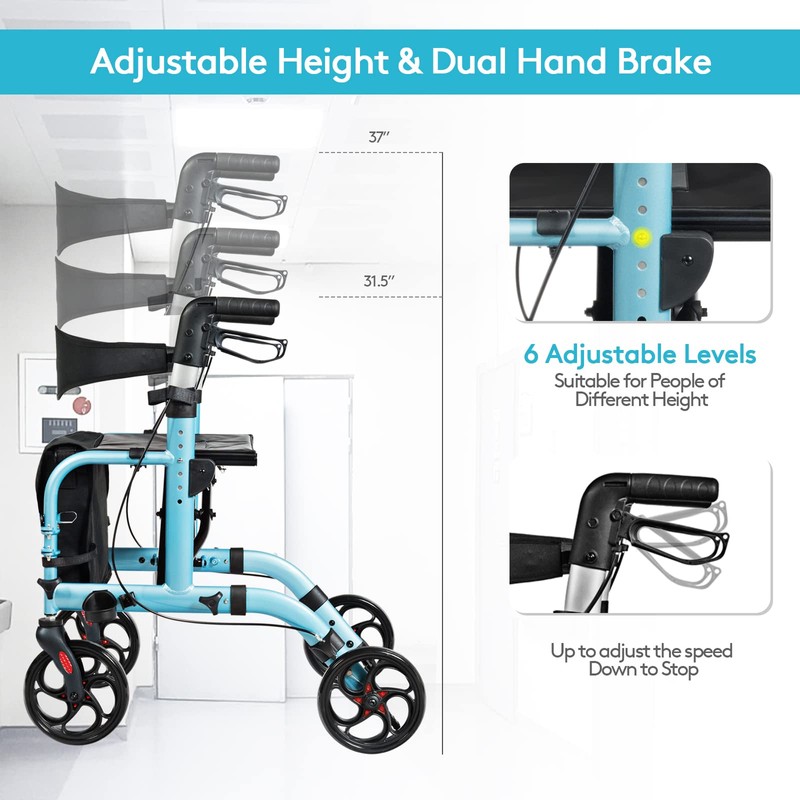 - 【6-Level Adjustable Heights】 The height of this rollator walker can be adjusted from 33.5” to 38.5” with 6 level, which fits people of different heights. Moreover, the handbrake has two functions, lifting up to lower the speed or pulling down to stop the walker immediately.
