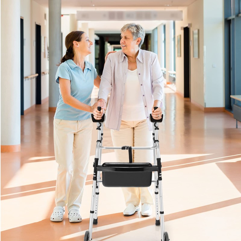 - 【Selected Material & Foldable Seat Cushion】Crafted from premium aluminum alloy with anti-rust finish, this folding walker is not only capable for long time use, but also strong enough to hold up to 330 lbs. What’s more, this walker is ergonomically equipped with a soft and foldable seat cushion for comfortable rest if needed.