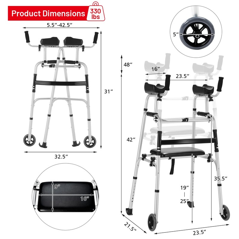 Effortlessly change it to an ordinary walker by removing the comfortable PU armrest Easy to unfold and fold with no tools required