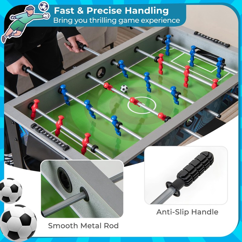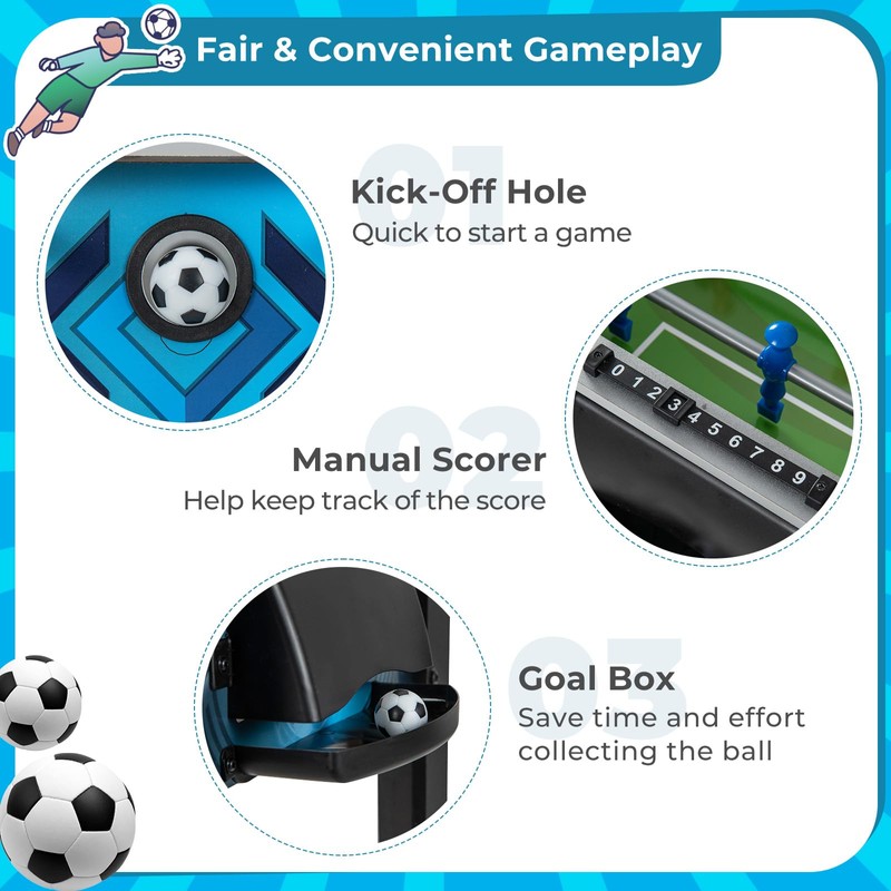 - Enhanced Features & Easy Assembly: This foosball arcade table comes equipped with manual scorers, kick-off holes and goal boxes that keeps track of the score easily and allows you to experience intense and competitive gameplay experience. With simple instructions included, setting up this foosball table is a breeze. Its compact size makes it a great addition to various scenarios, such as home, game rooms, offices, dorms, pubs and more.