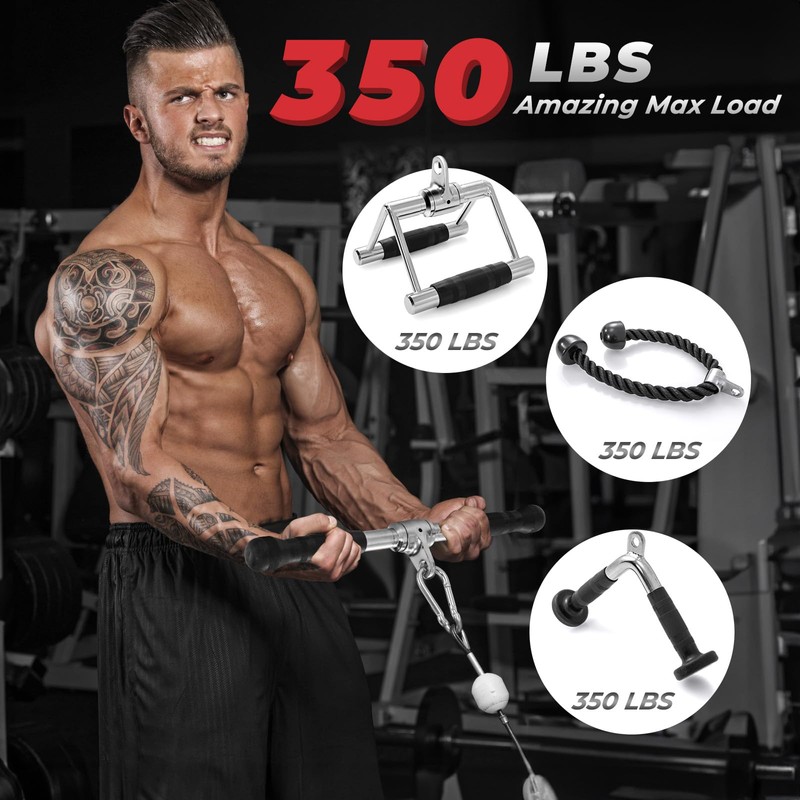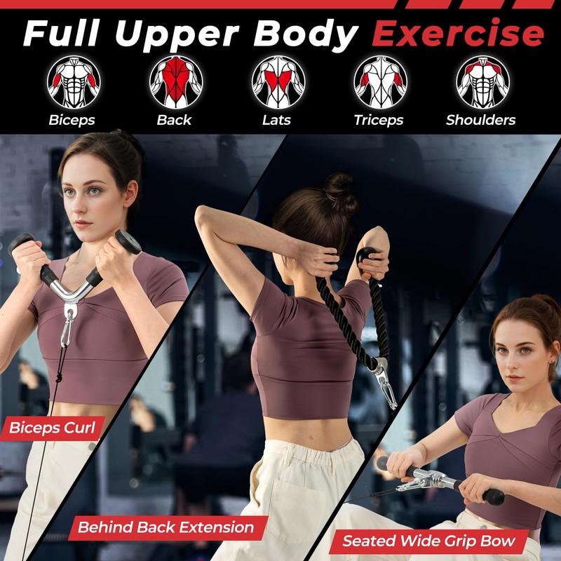- 【Multi-Functional Workout Handles】Designed to shape your body, this lat pulldown attachments provides a wide range of workout options to improve physical health and boost self confidence. With this gym set, you can easily practice upright cable row, biceps curl, bent over rowing, Seated Bow, pull down, behind back extension and more.