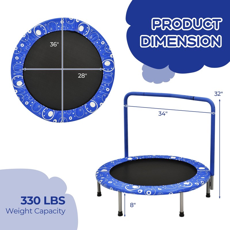 - 4-Step Assembly: Only 4 steps need to set up this small trampoline: open the main frame with jumping mat and fix with safety hook; Add safety pad; Add legs with anti-slip caps; Add handrail. Note: the handrail is not necessary, and you can use without it.