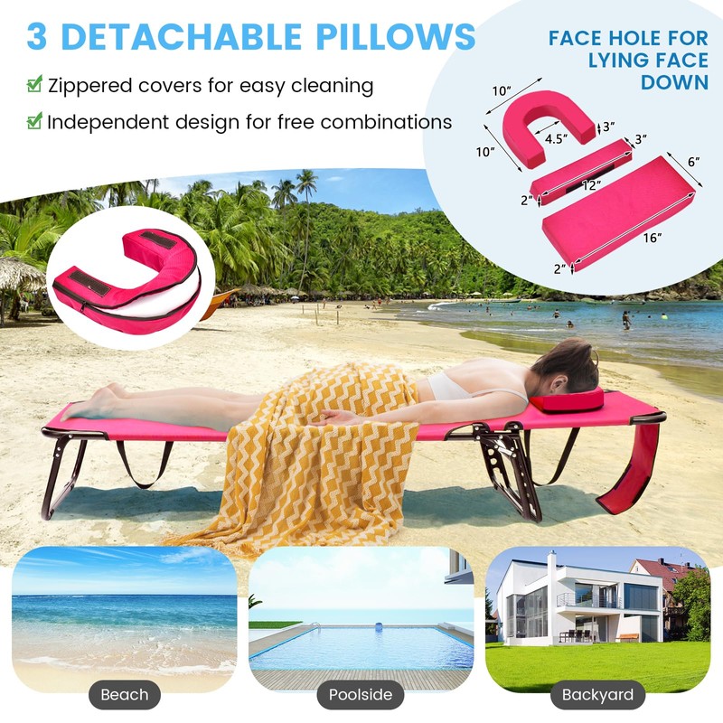 - 3 Removable Pillows & Face Hole: GYMAX face down tanning chair features 3 detachable pillows which can be taken down and washed separately. You can pillow on your beach chair to enjoy the sun and tan your skin more beautifully. You can also drink juice on your stomach and enjoy this leisure time. With hook and loop fastener, you can attach the pillow to the back if you don't want to use it.
