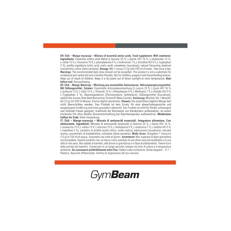 GymBeam GymBeam EAA Pulver - Komplexe Quelle fr essentielle Aminos?uren, mit EAAs und BCAAs, ideal fr Muskelregeneration und Muskelaufbau, Aminos?uren-Pulver fr Hormon (250 g, Mango-Maracuja)