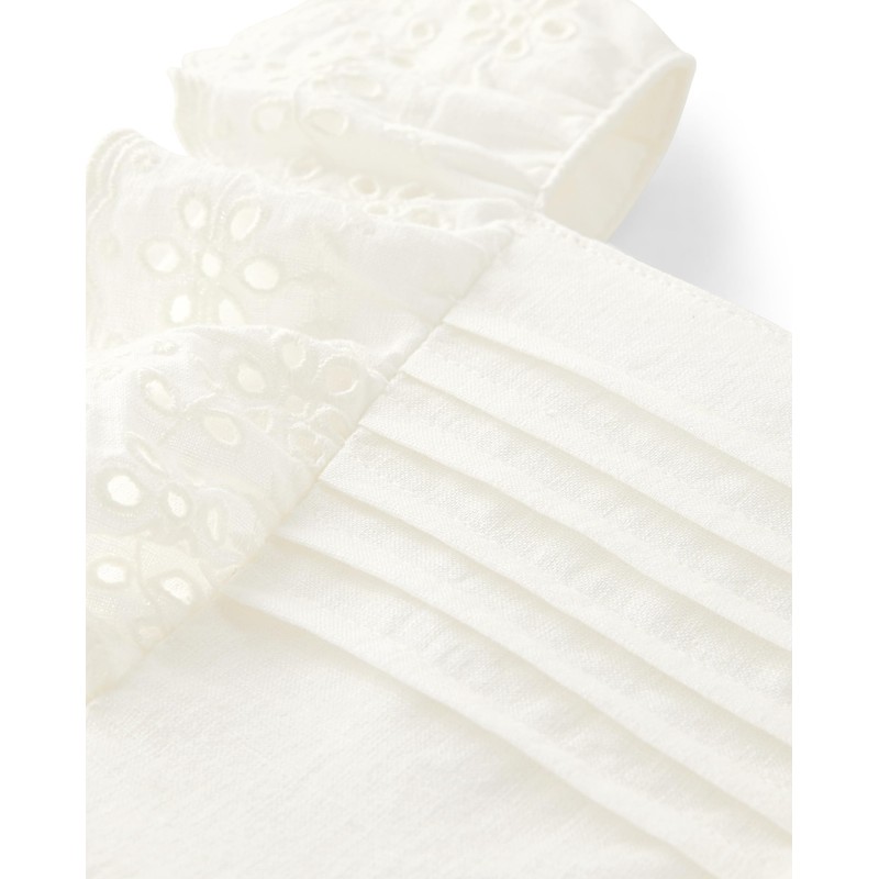 - DESIGN — Features eyelet details, pintucks at bodice and flutter sleeves