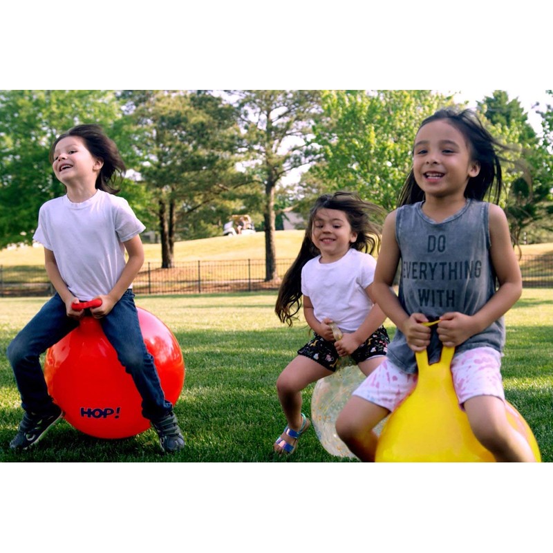 This Hop Ball is the very best quality in hopping balls! Made from super strong, yet soft vinyl and latex-free material for long lasting use and durability. Great exercise product for indoors and smooth safe outdor surfaces. Promotes children's body coordination, balance, lymph circulation and provides a fun work out while hopping on the ball. Special patented handgrip safety handle. Maximum sustainable weight up to 600 lbs based on the size of the ball. Inflate with a hand or foot pump.
