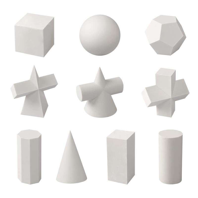 Study Material : This set of geometric solids is ideal for learning the shading relationships in sketching. The resin geometry mold set includes ten shapes: Cross cone, cross square cone, cuboid cross column, cube, pentagonal (polyhedron), sphere, cuboid, cylinder, octahedron, cone—fulfilling various needs