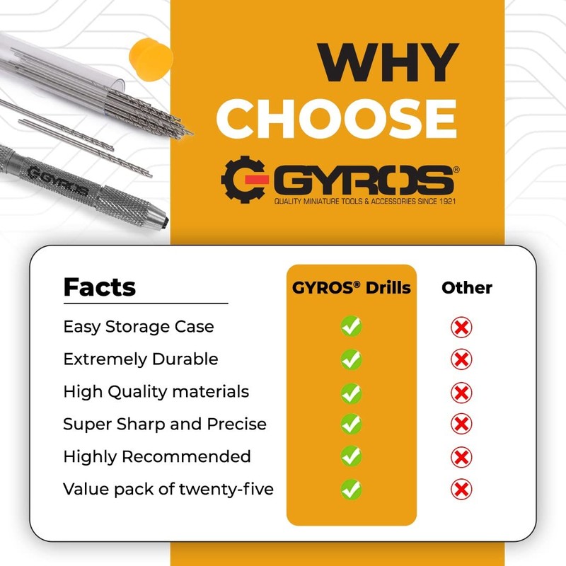 - Constructed with Carbon to take on intricate drilling tasks where accuracy is critical. Gyros drill bits deliver precise holes in gold, silver, brass, PVC, wood, hard and soft metals, as well as plastic