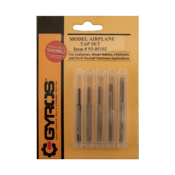This Five (5) piece set was specifically designed for the Model Airplane enthusiasts. Used for putting threads in a hole made with a tap drill. Can be used for a wide range of materials such as low carbon steels, stainless steel, copper, brass, aluminum and plastics. Set includes the following taps:.