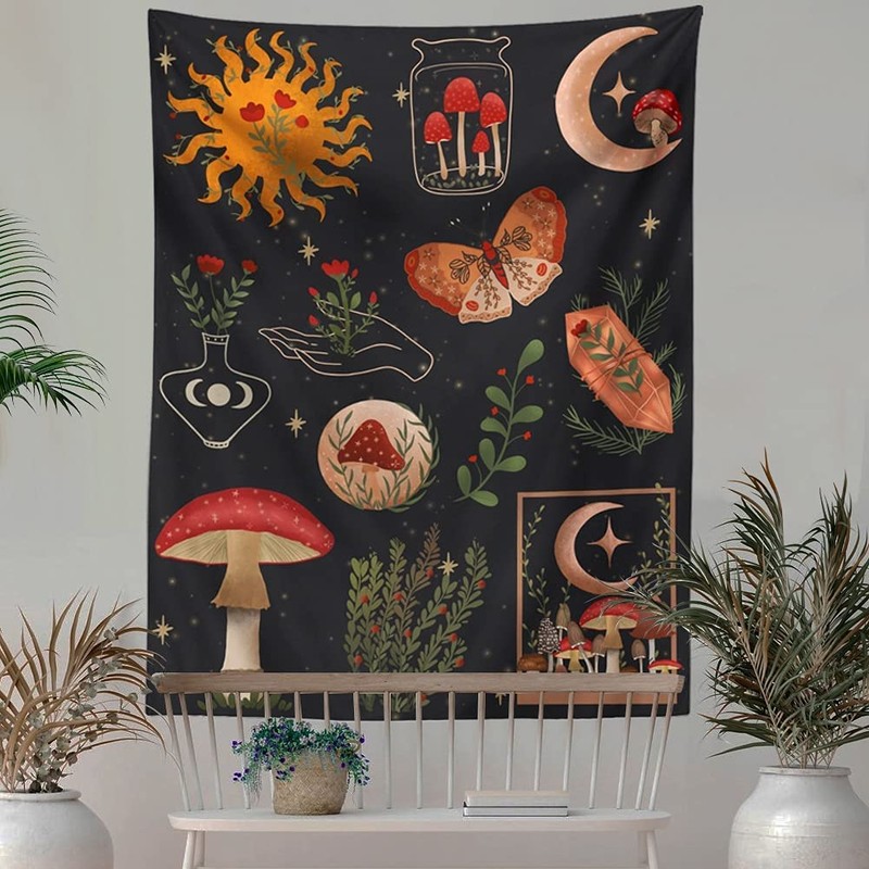 GYW Botanical Mushroom Tapestry Wall Hanging Floral Sun Moon Starry Chart Wall Tapestry Hippie Bohemian Tapestries for Badroom Home Decor (59x79inch)