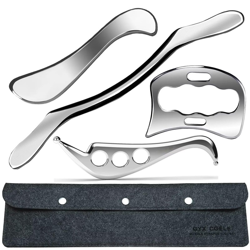 - PROFESSIONAL SET: Complete 4-piece stainless steel muscle scraping tool set featuring specialized shapes and ergonomic designs for various muscle groups and treatment areas