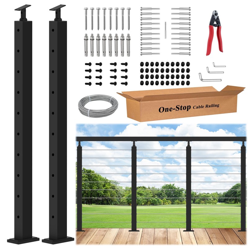 Gyykzz One-Stop Cable Railing Post Kit, 2Pack Level Drilled Line Post 36", Adjustable Top Cable Railing System Including 2 Railing Post, 82ft Cable, 10 Sets Terminal, 40 Cable Grommets (No Handrail)