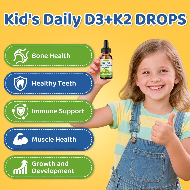- Enhance Nutrient Absorption & Support Muscle Health - Formulated with MCT oil as a natural carrier, our D3 K2 liquid drops boost the absorption of Vitamin D3 and K2, ensuring these vital nutrients effectively reach your child’s body. Alongside calcium, this combination not only strengthens bones and teeth but also supports healthy muscle function, helping your child stay active and strong throughout their growth*