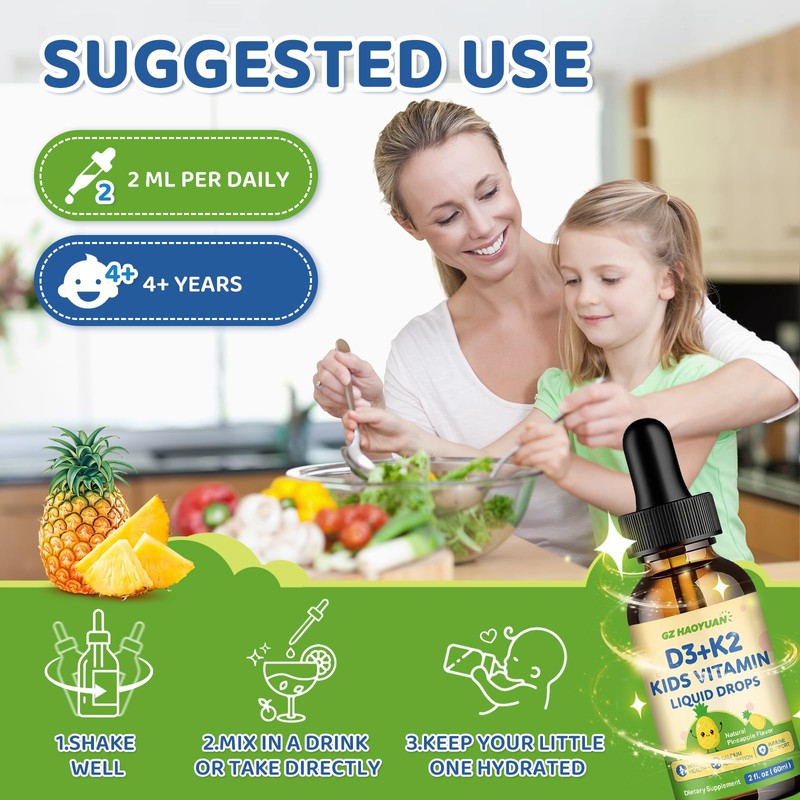 - Pure Formula & Yummy Pineapple Taste - This kids D3+K2 liquid supplement combines Vitamin D3, K2, and Calcium in a clean, gentle formula, free of artificial additives, colors, or preservatives—making it a great choice for children with delicate digestion. The naturally sweet pineapple flavor makes it enjoyable to take, while the liquid form helps ensure faster, more efficient absorption than traditional pills*
