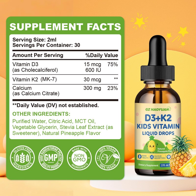 GZ HAOYUAN Kids Vitamin D3 K2 Drops, Vitamin D3 K2 (MK-7) Supplement with Calcium for Kids & Adults - Support Strong Bones, Teeth & Immune, Fast-Absorbing Pineapple Flavor 2 FL OZ