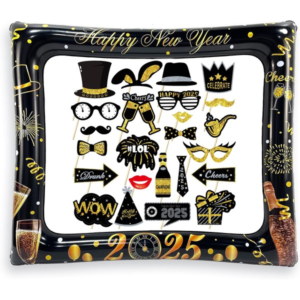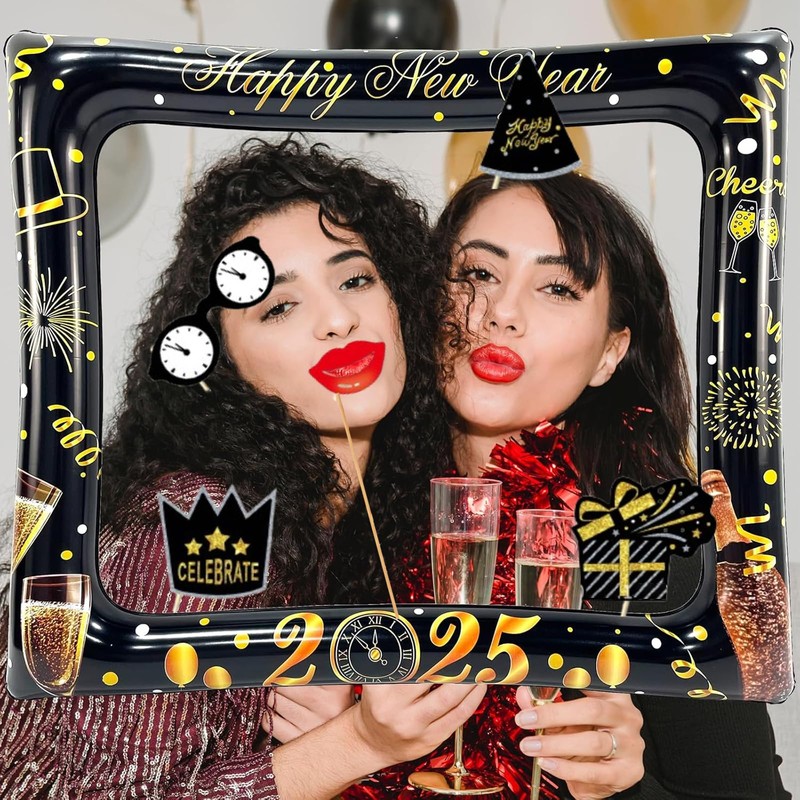- 【Complete New Year's Eve Selfie Package】:The set includes an inflatable new year selfie photo frame and 24 fun photo booth props, giving your New Year’s Eve party the ultimate selfie station for memorable group shots with friends and family.