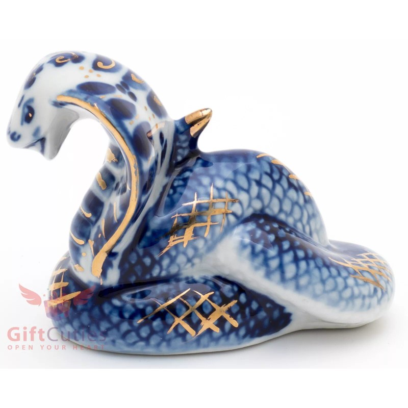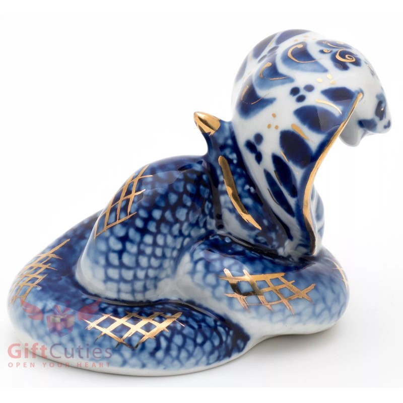 Gzhel Porcelain Cobra Snake Figurine with Gold Accents, Symbol of 2025, Handmade
