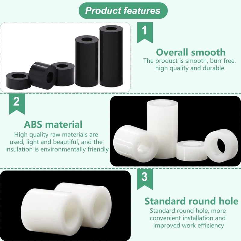 - Quality material: spacer plastic made of ABS, the surface is smooth without burrs, the opening is flat, they have good insulation, temperature resistance, oil resistance, corrosion resistance and tear resistance, so are very suitable for industry, have a long service life.