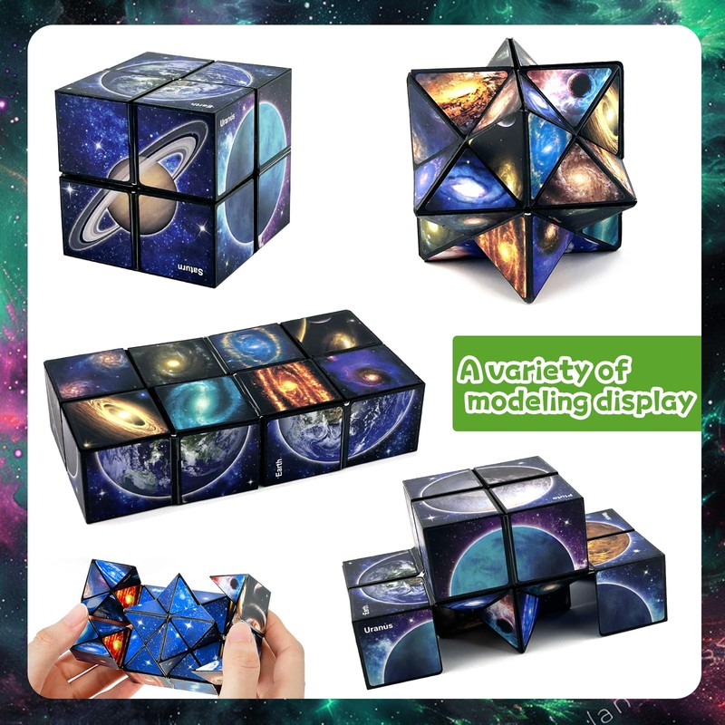 • 2 in 1 Galaxy Cube: This shape-changing magic cube, including Saturn, Uranus, Pluto, Earth, Moon and Venus. can improve children's colour sense and memory. Can also develop children's understanding of geometric space.
