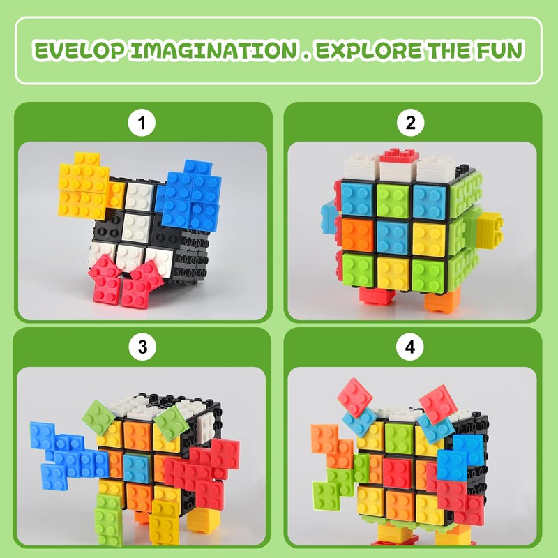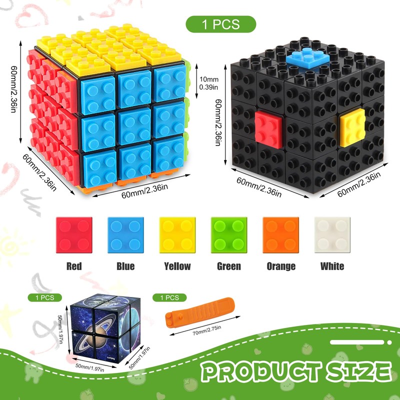 • Package contents: the Kubik Rubik set contains black base, and 6 different coloured building blocks. With 1 blue starry sky 2-in-1 shape changing magic cube and 1 disassembler. You can decorate the cube with your own blocks to create fun new toys.