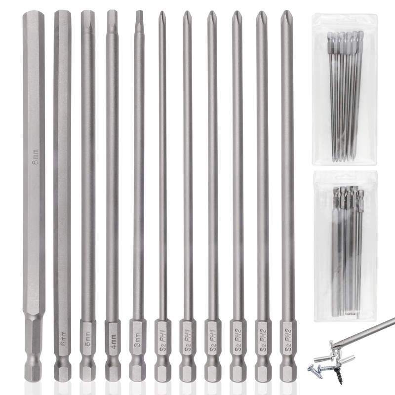 - Box contents: you will receive 11 long bits set, there are 2 specifications of screwdriver bits in the pack, or 6 Phillips screwdriver bits and 5 hexagonal screwdriver bits. In the Phillips screwdriver bits specification or 3PH1, 4PH1, 4.5PH1, 4.5PH2, 5PH2 and 6PH2; the hexagonal bits specification size or 3 mm, 4 mm, 5 mm, 6 mm and 8 mm.