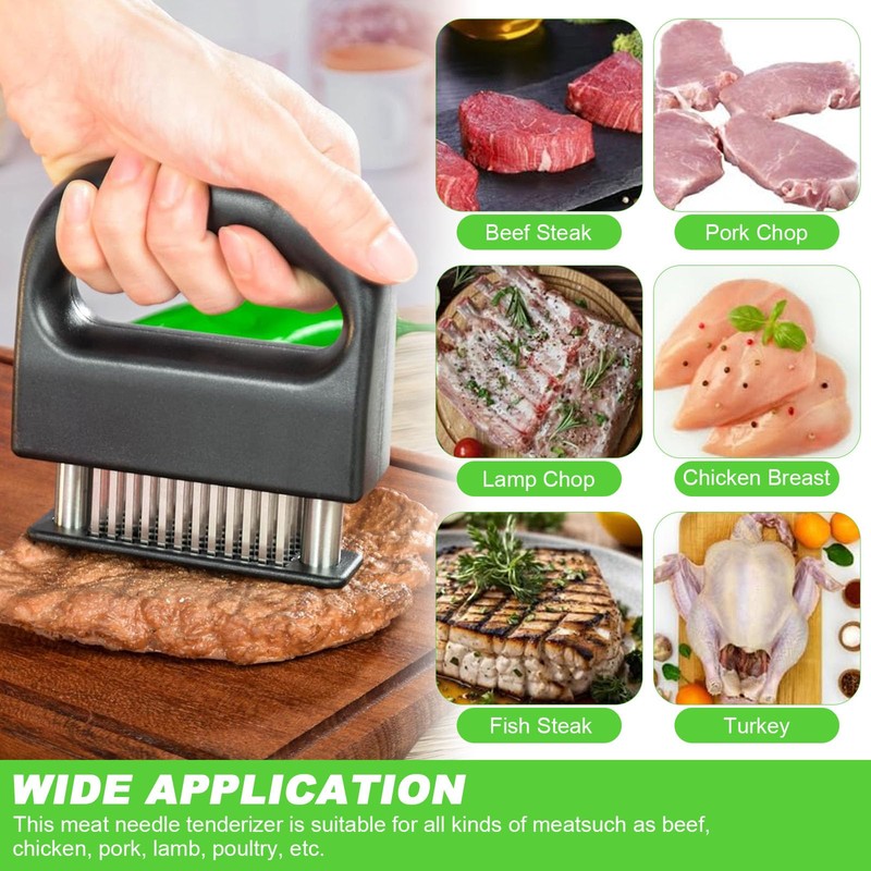 - Sharp blades: our meat tenderizer needle comes with 48 blades made of stainless steel with hard texture, durable without corrosion and rust. The dense tooth pattern penetrates easily into the meat fibres, makes steaks, pork chops, etc. Quickly tender and improves cooking efficiency