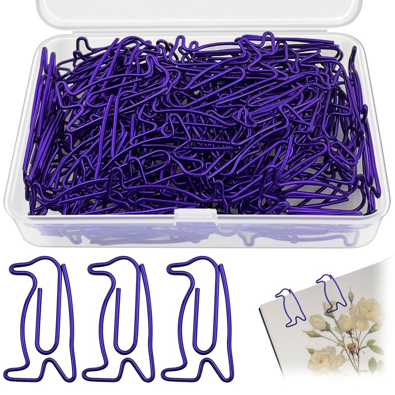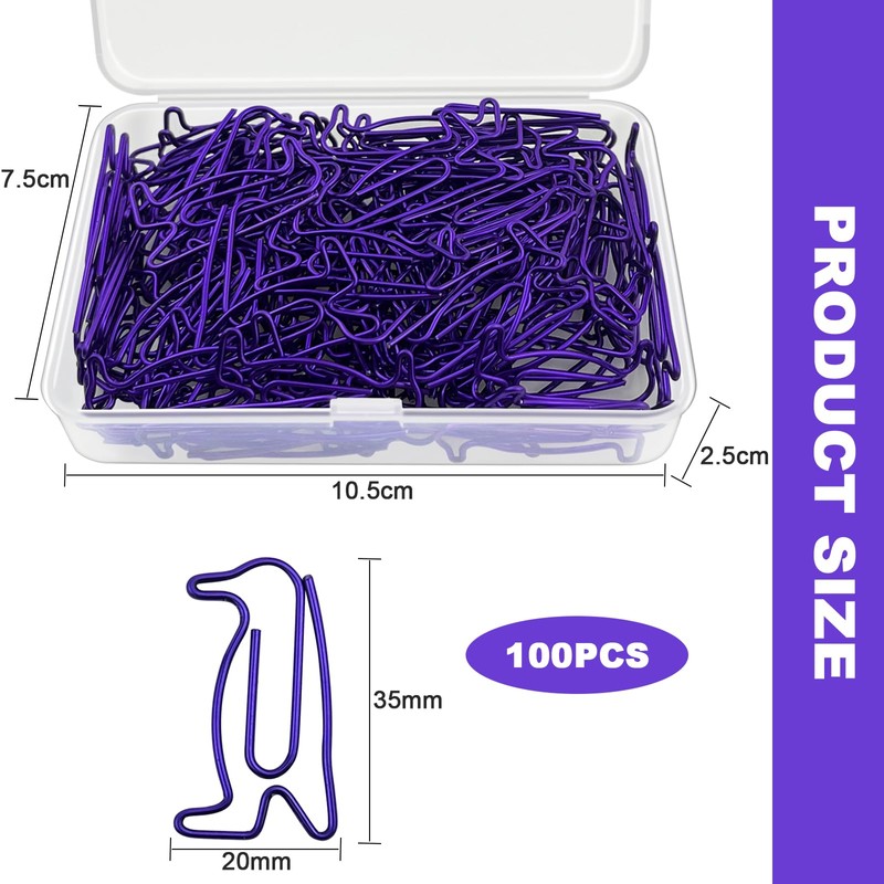 GZqiancang Pack of 100 Penguin Paper Clips, Penguin Shaped Paper Clips with 1 Piece Transparent Box for Book, Memo, Paper, Poster, Photo, Paper Clip (Purple)