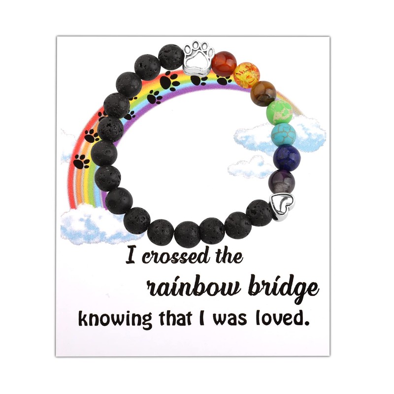 - Description: pet paw bracelet with a card saying ‘I crossed the rainbow bridge knowing I was loved’, this memorial gifts perfect for people who loss their beloved pet. Your pet mark always in your heart and in the future of decades, you will meet on the rainbow bridge.