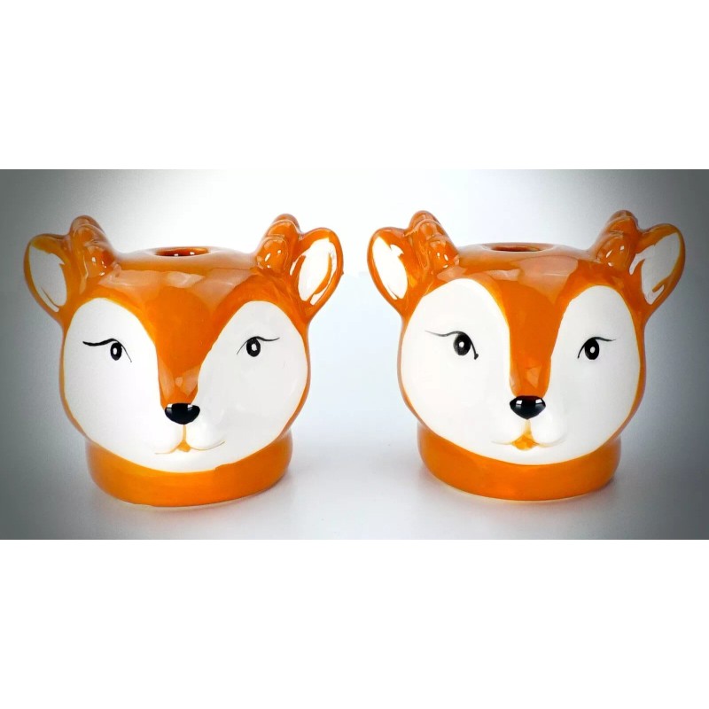 H for Happy Reindeer Candle Holder Stoneware Taper Decor Holiday Hand Carved Festive 2 Pack
