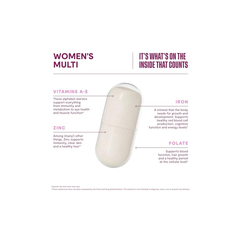 • WHAT'S INSIDE: Vitamin A, B Vitamins, Vitamin C, Vitamin D, Vitamin E, Calcium, Folate, Iron, Magnesium, Niacin, Potassium, Zinc, and moreplus a Womens Total Health Blend of Cranberry, Acai, Pomegranate and Papaya.