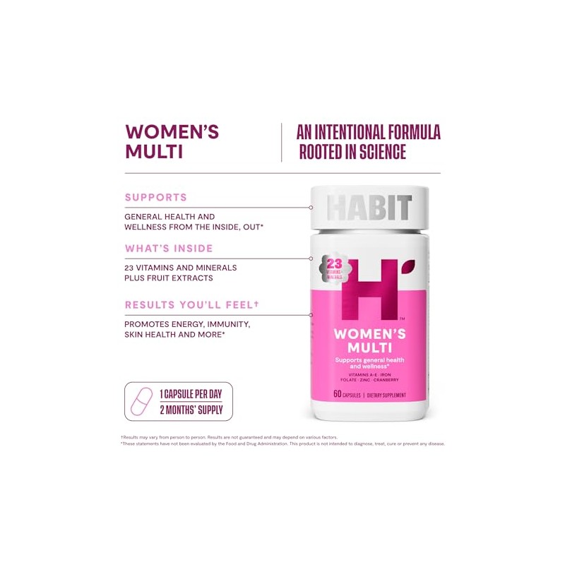 Looking to fill gaps in your diet, or get back to feeling more like you Enter HABIT's Womens Multivitamin supplement an all-in-one support system for general health and wellness. This broad spectrum supplement for women supports everything from immunity, energy, mood and sleep, through to a healthy period, hormones, soothed muscles and skin*. With 23 essential vitamins and minerals in an easy-to-swallow capsule, each serving contains Vitamins A-E, plus Biotin, Folate, Iron, Magnesium, Niacin, Potassium, Zinc, and Calcium, along with antioxidant-rich Cranberry, Acai, Pomegranate and Papaya. These non-GMO capsules are free from gluten and synthetic colors and flavors. *These statements have not been evaluated by the Food and Drug Administration. This product is not intended to diagnose, treat, cure or prevent any disease.