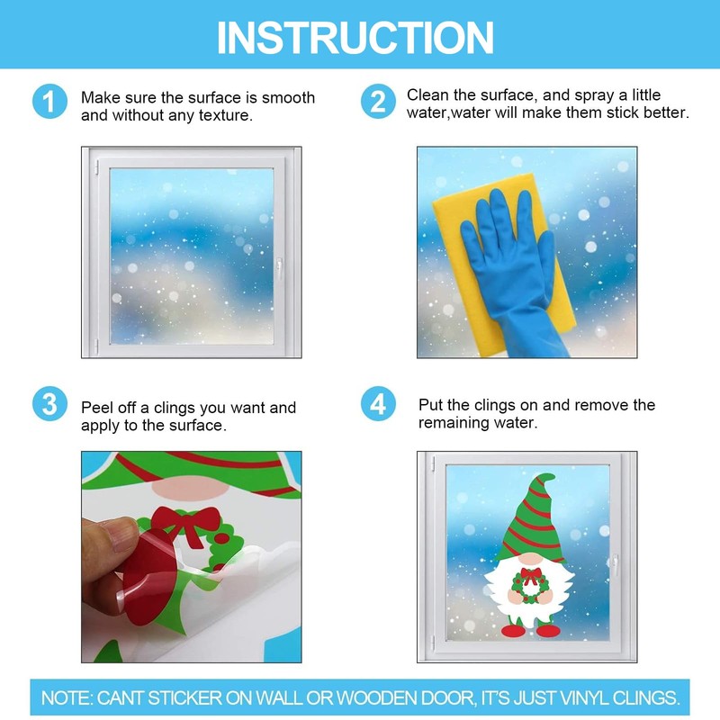 - 🎄【Easy To Use】No glue is needed.Before you stick the window clings on the window, you need to wipe clean the windows that need to be pasted, spray a little water, and paste the window stickers on.