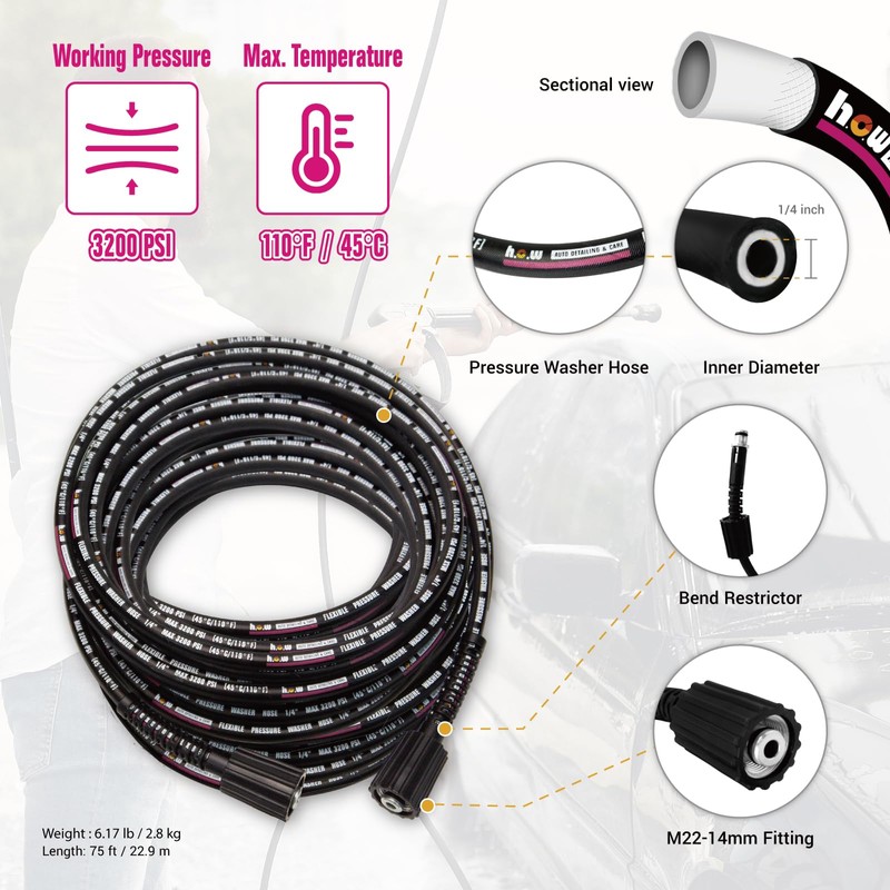 H.O.W DETAILING 1/4" x 75 ft Pressure Washer Hose, M22 Fittings Kink-Free Power Washer Replacement Hose, 3200 PSI