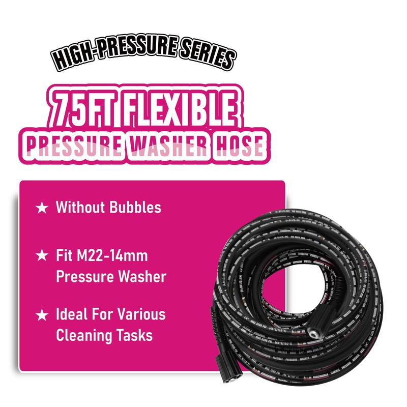 - 【Versatile Fit】H.O.W flexible high-pressure washer hose, with its 1/4-inch inner diameter and 75 feet length, is perfect for a range of cleaning jobs. It's a must-have tool for professionals and DIY enthusiasts for washing cars, windows, siding, driveways, and roofs. Note: Please avoid connecting to a garden hose or faucet.