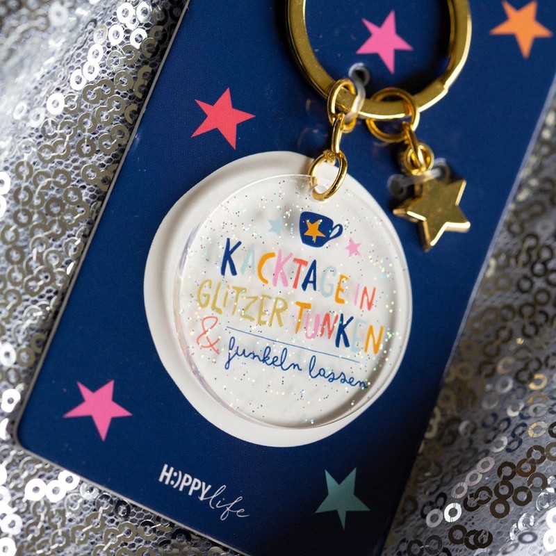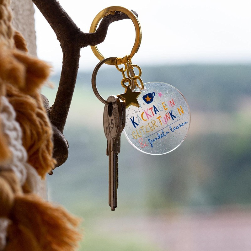 - Key chain with keyring: bag pendant or key ring with glitter motif and golden star charm, with saying "... in glitter dipping and sparkling", pendant in transparent acrylic look with key ring, length 8 cm, nickel tested.