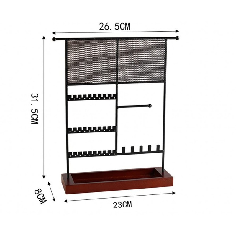 High quality and fashional Design: it made from metal and wooden with black colour, with 4 layers and different many holes and hangers, you can hanging more than 200 holes, you can hanging earrings in different parts. The long poles you can hang watchese necklace bracelets and so on