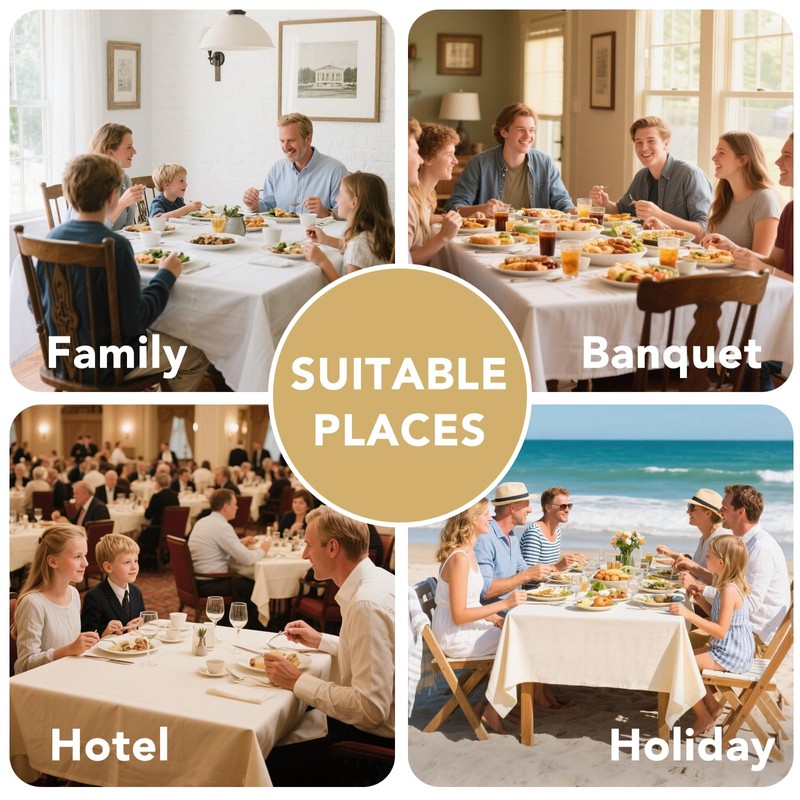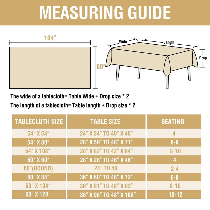 - MULTIPLE APPLICATION: Our tablecloths create the perfect look for a variety of happy occasions— perfect for everyday use, party, holidays, catering, cafes, special occasions, dinners, brunches, potlucks, BBQ's, buffets, baby showers, indoor and outdoor use, weddings and more