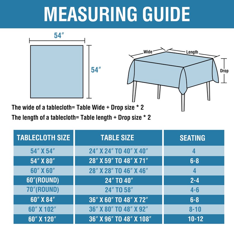 - Sizes: Table cloth 54x54 inches, 54x80 inches, 54x108 inches, 60x60 inches, 60x60 inches(round), 60x84 inches, 60x102 inches, 60x120 inches