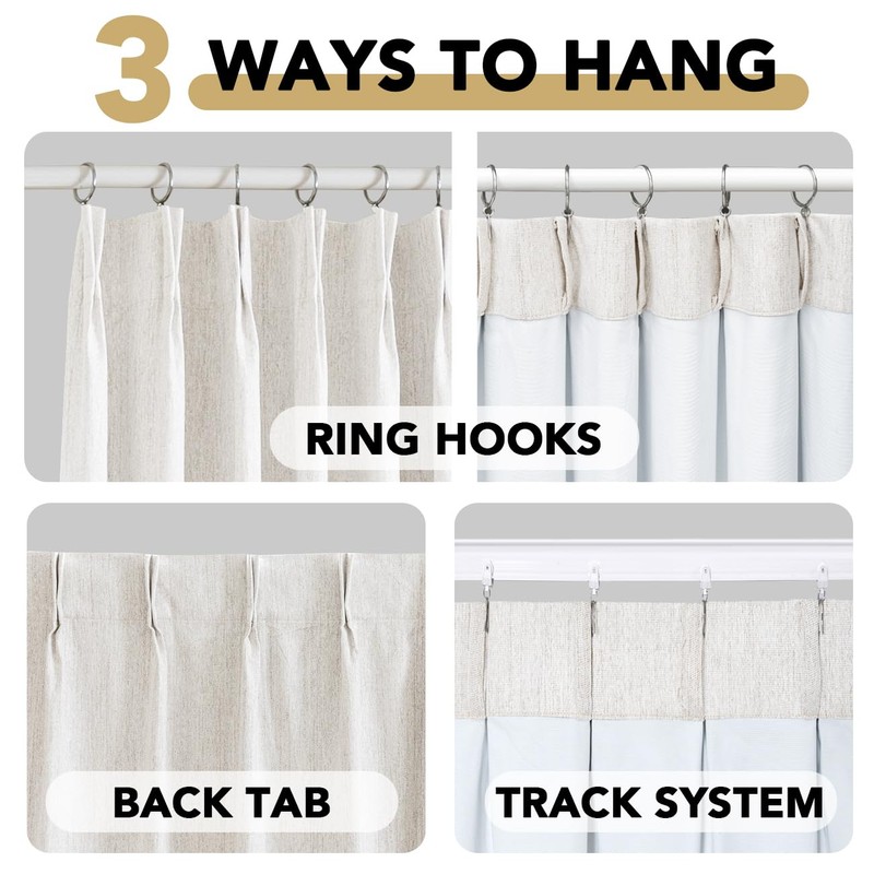 - MULTIPLE HANGING OPTIONS: Featuring 3 different hanging methods - Ring hooks (Includes 20 hooks), back tab, clip rings, or for track system (clips and rings are not included). These pinch pleated curtains with hook are easy to install and adaptable to various window treatments
