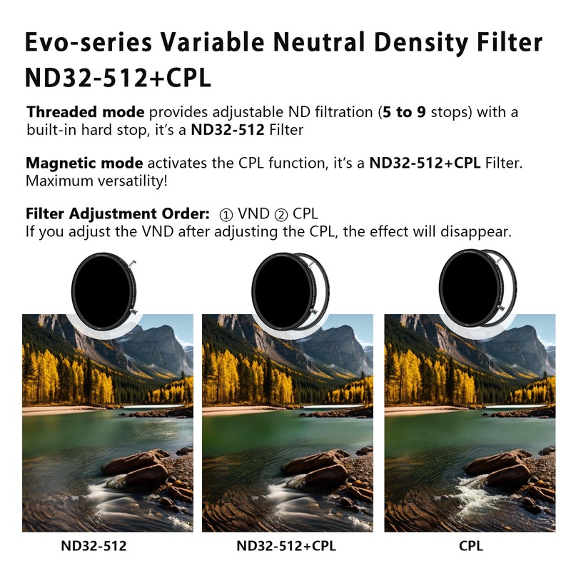 - INNOVATIVE WAYS TO USE: EVO Variable ND Filters can be used as screw-in Variable ND filter and magnetic Variable ND filter&CPL 2 in 1. So if photographers and videographers are seeking precision, convenience, enhanced image quality, optimize the workflow and improve efficiency and rapid transitions, the EVO ND Filter has you covered
