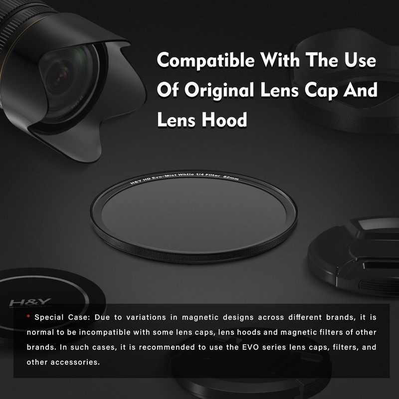 • NOT INTERFERE WITH USE OF ORIGINAL LENS CAPS AND LENS HOODS: EVO-Series White Mist Filter has been meticulously redesigned to match the dimensions of traditional threaded White Mist Filter. Say goodbye to the hassle of constantly removing and reattaching accessories when using your White Mist Filter. EVO-Series White Mist Filter seamlessly integrate into your workflow, preserving the convenience of your camera's standard accessories