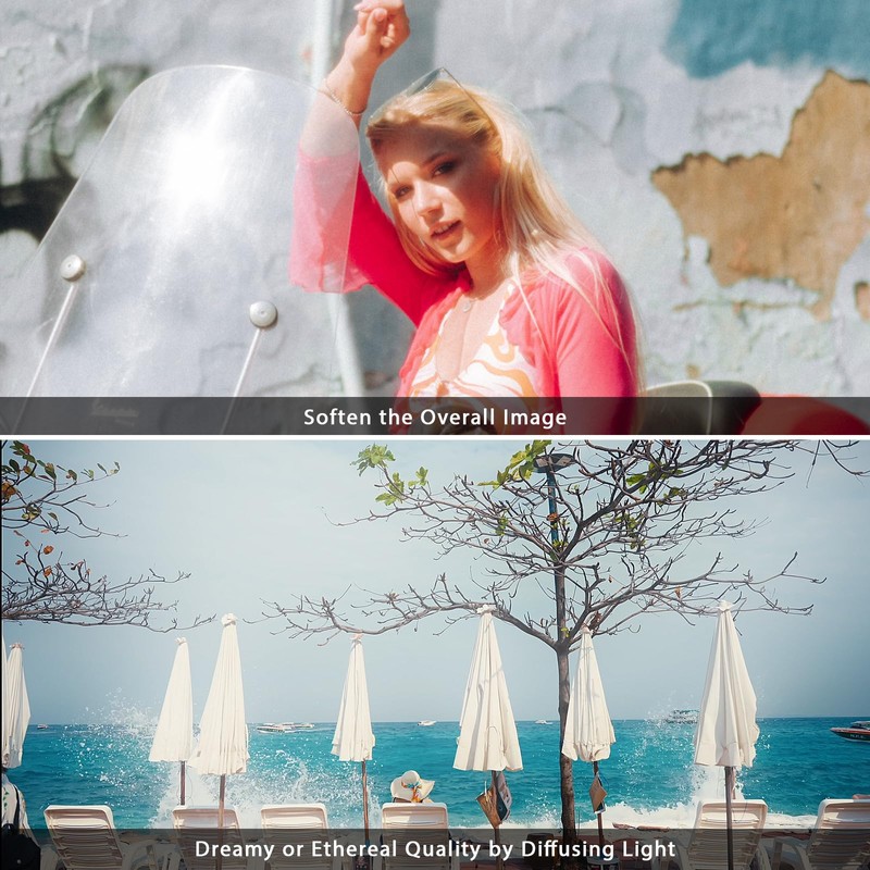 - LESS VIGNETTING WORRIES: EVO white mist filters allows for instant switching to threaded attachment, significantly reducing the likelihood of vignetting. This feature is particularly valuable for videographers, enabling them to adapt swiftly to various shooting scenarios without compromising image quality