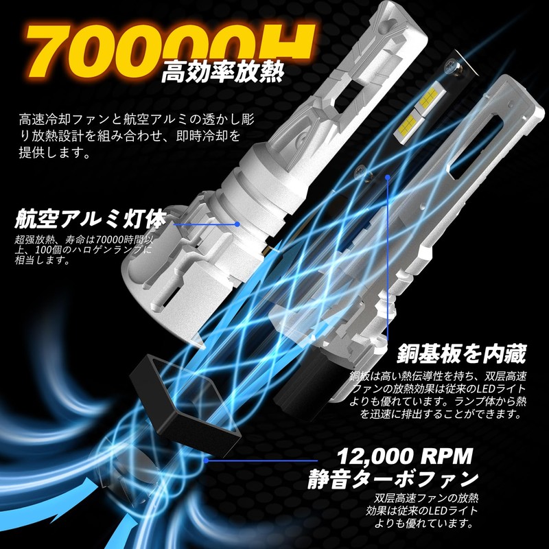 • (Excellent Heat Dissipation Performance & Long Life) The body of the LED headlight is made of aluminum alloy with excellent heat resistance and heat dissipation, and is equipped with a 20,000 RPM / Min, high speed quiet cooling fan that dissipates heat quickly and prevents overheating issues. The LED bulb provides excellent heat dissipation protection, so it can greatly extend the service life of the product. Double Red Copper Base + Double Vacuum Heat Pipe Technology 60 times more heat dissipation than conventional copper base Full heat dissipation and long service life