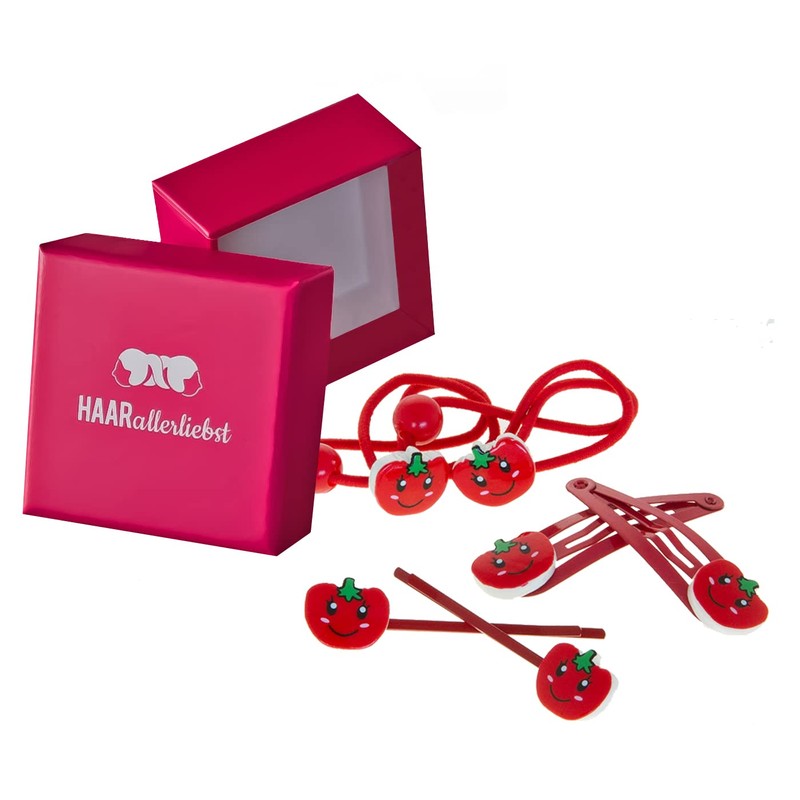 - Colourful box for storage: in this HAARallerliebst hair clip box there are 2 hair clips, 2 hair clips and 2 hair bands in red with small tomatoes. Thanks to the included high-quality box, all children's accessories have a place where you can find them again and again and never have to go searching again. In addition, every little girl will enjoy the great treasure chest.