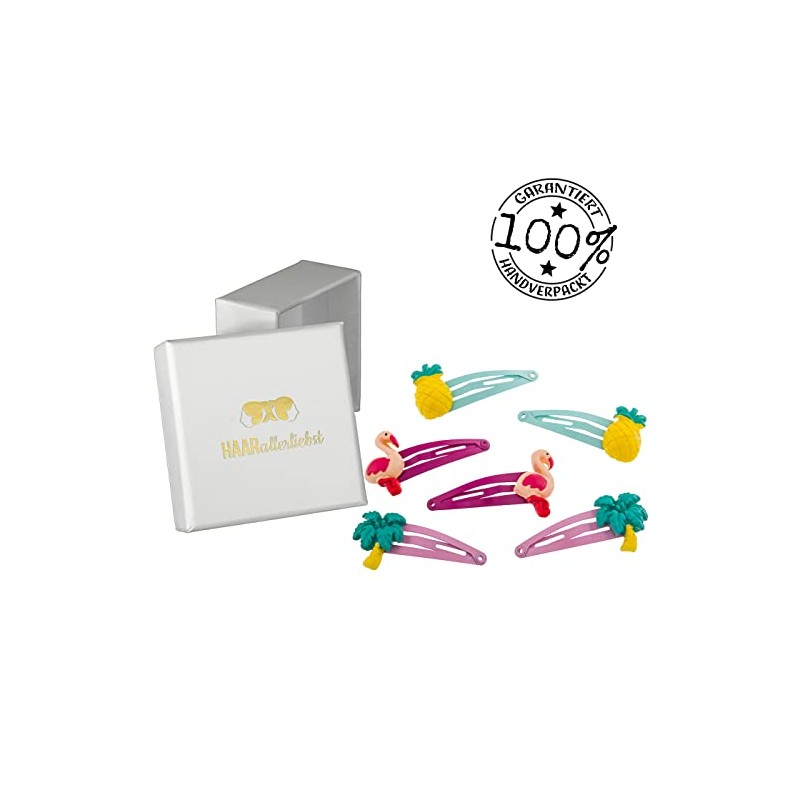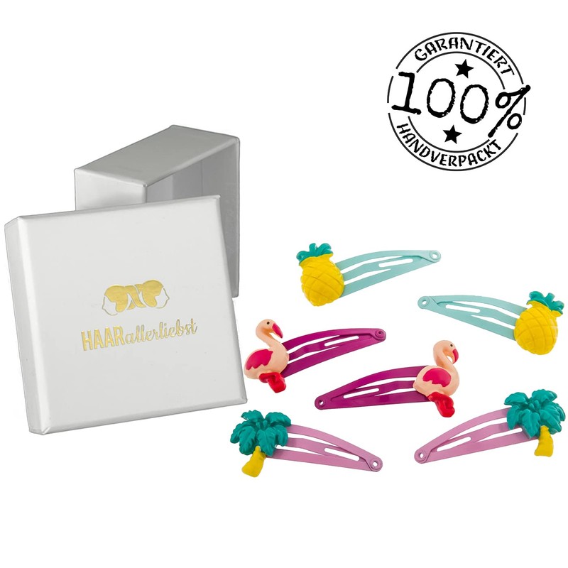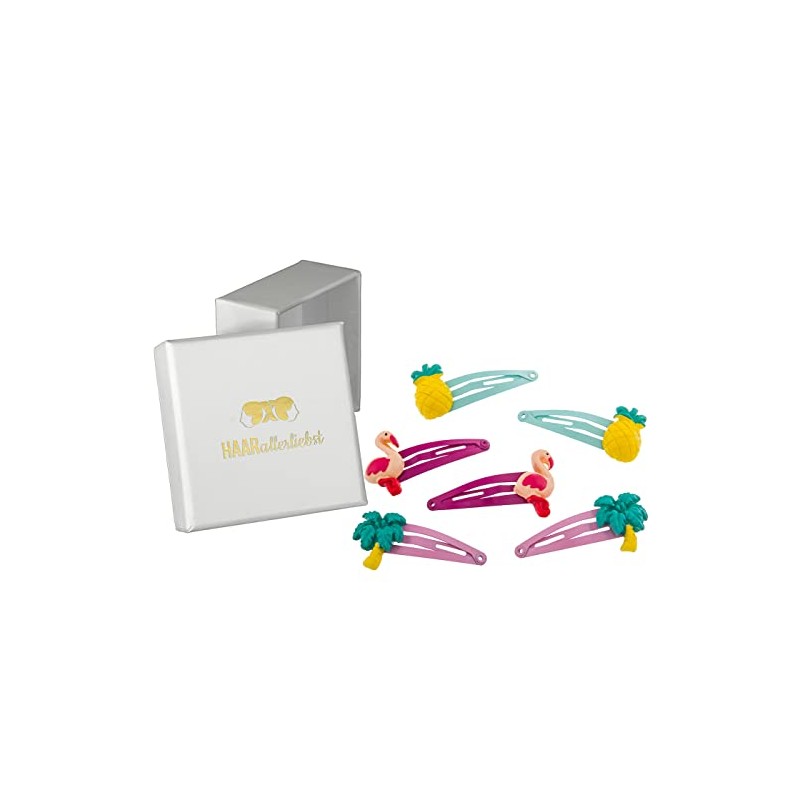 - Colourful box for storage: in this HAARallerliebst hair clip box there are 6 colourful hair clips, two of each type with the same flamingo, pineapple or palm tree figure. These come in a great small box, which serves great as storage for all children's accessories. In addition, every little girl is happy about the great treasure chest.