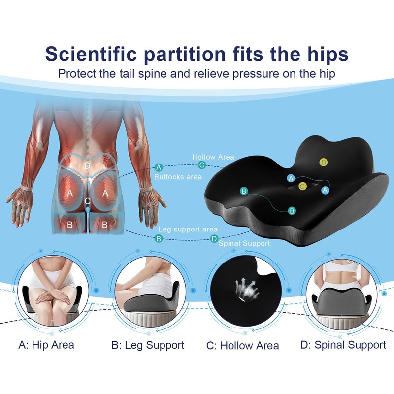 - Effectively Relieves Sciatica - This seat cushion for tailbone pain relief adopts an ergonomically designed contour,the backrest is designed to support the tailbone and keep your spine in a neutral position,relieve pressure on the buttocks, support the hip curve, and is specially designed for hip injuries.