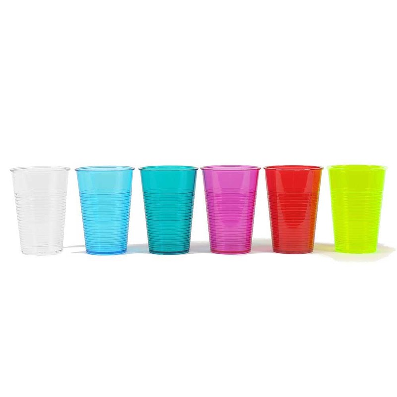 The set consists of 4 clear plastic cups, clear in a variety of colours.
