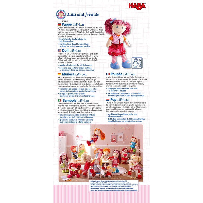 • 気まぐれな柔らかい人形 Lilli-Lou は明るいブルーの目とそばかすが魅力的な刺繍された顔に散りばめられています。 彼女の華やかなピンクの髪は、甘い水玉のリボンが付いた2本のピグテールで結んだシェニール織で作られています。