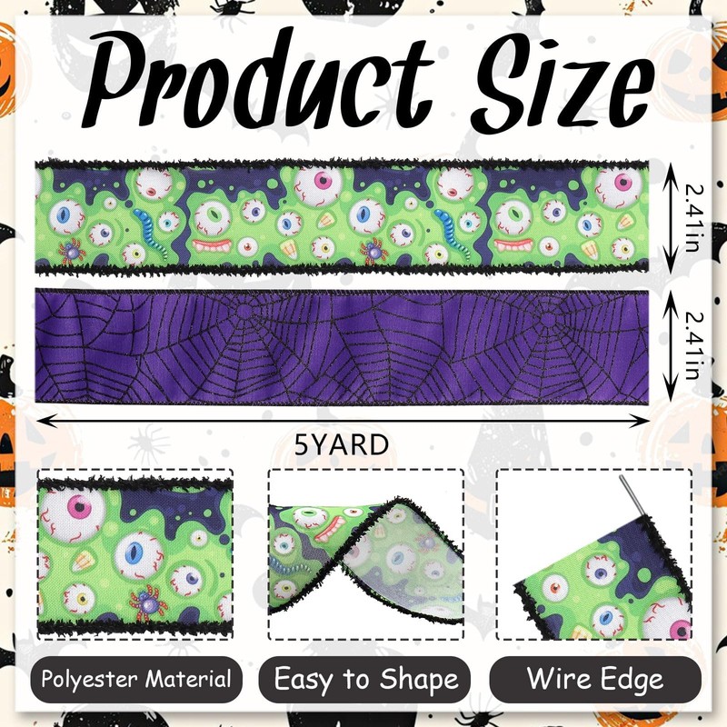 - 【Halloween Theme Design】This uniquely designed Halloween ribbon set includes two different patterns: one with eerie eyeball and bug patterns, and the other with a classic purple spider web pattern. The vibrant colors and vivid designs make the ribbon stand out in any decoration, creating a strong Halloween atmosphere. Whether used for indoor decorations or outdoor setups, these ribbons add a special touch of horror and fun to your festivities.