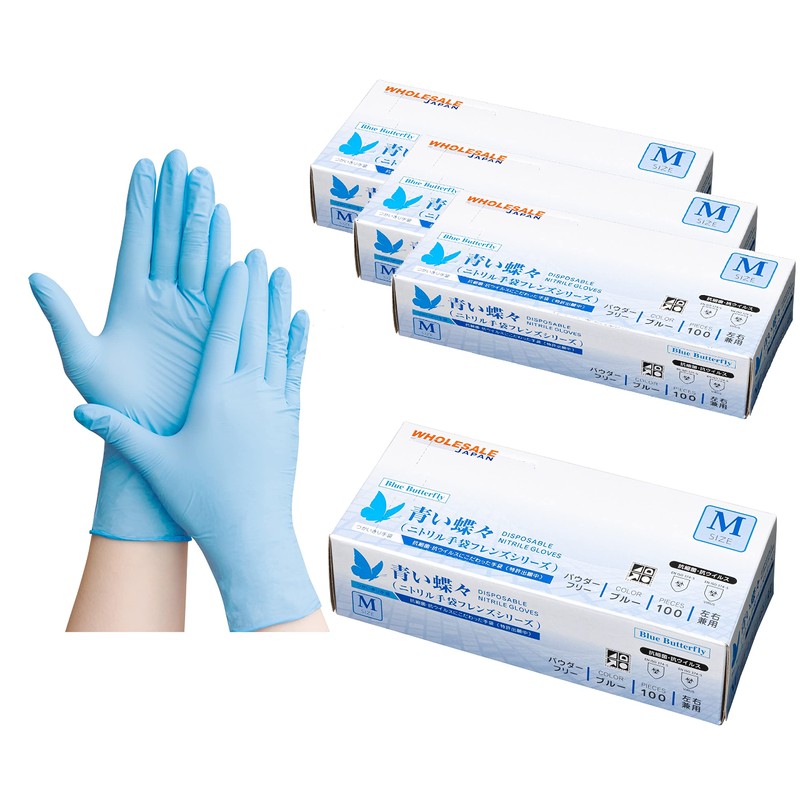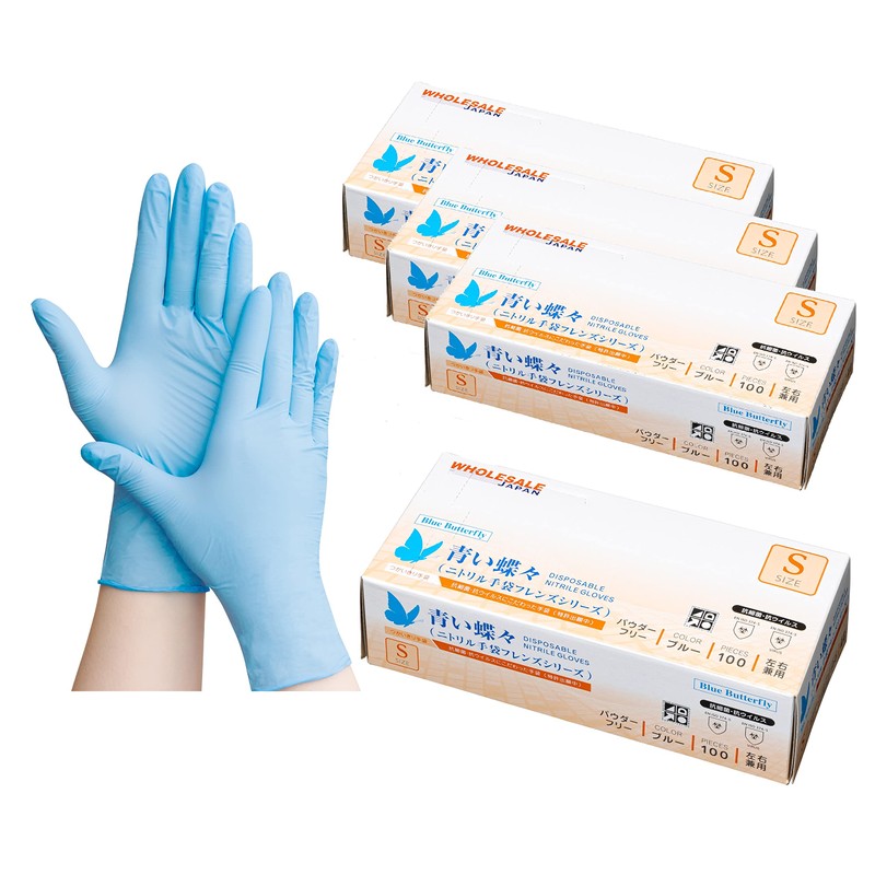 青い蝶々シリーズ【HACCP認証品】伸びるニトリル手袋 食品衛生法適合 1箱100枚入 ぴったりフィット ニトリル手袋 使い捨て 薄手 左右兼用 青 ブルー 粉なし(パウダーフリー)衛生用 業務用 介護用 食品加工工場・病院採用商品 (極薄手) ホールセールジャパン特許出願中 (Small, 1箱(100枚))